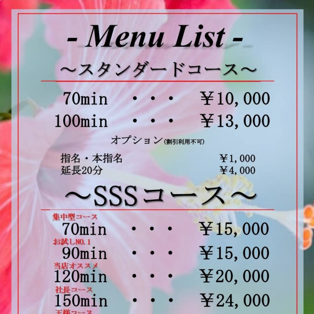 お身体の疲れだけではなく、心の疲れも癒す特別なリラックスタイムをお楽しみください。メンズエステのレジェンドセラピスト達とコラボレーションした、当店オリジナルのSSSコースをぜひお試しください。